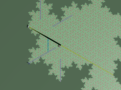 Click on the two images below to show an animation of Dorothy walking along the path displayed on a "level-6" set of super-clusters (the two images below are obtained at level-4). The first (straight) path connect the starting position to the Emerald city, whereas the second image show Dorothy leaving the yellow brick road and arriving through a second crossing point at the Wicked Witch of the West castle.