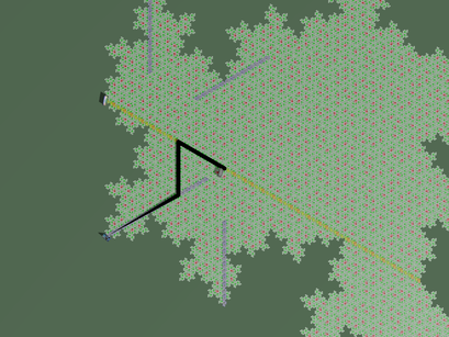 The result of a level-6 subdivision process starting from a conglomerate of 3 clusters, one H7 and two H8 (see below), becomes the Land of Oz. The "infinite" worm is the yellow brick road, the path that Dorothy takes to reach the Emerald City. Many departing roads lead to various places; a randomly selected one leads to the castle of the Wicked Witch of the West...